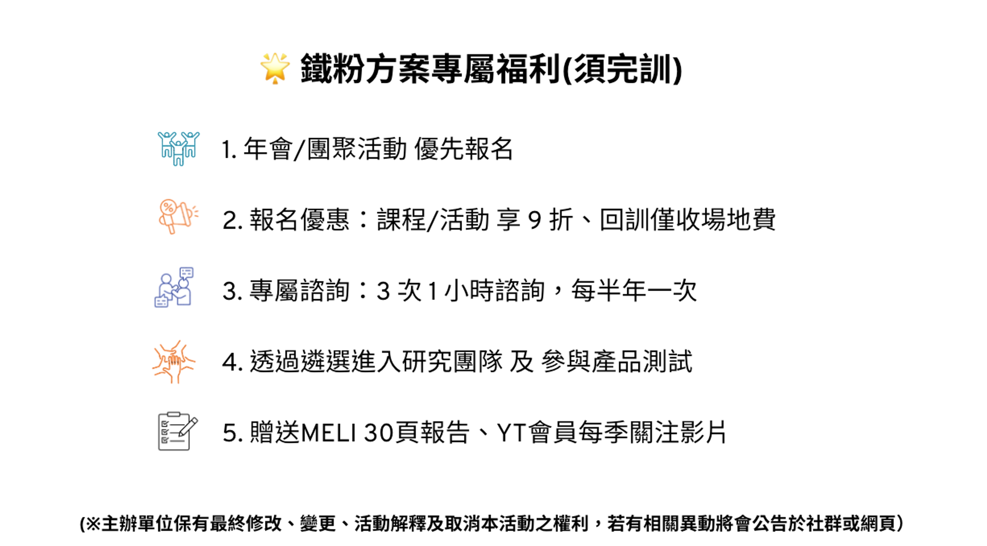 在早鳥期間報名鐵粉方案,將可獲得 MELI (Mercado Libre) 30頁彩色報告一份。未來,我們還有很多計劃,例如年會、產業課程、固定聚會、創立研究團隊、重點股追蹤系統…等計劃,也希望鐵粉夥伴可以扮演關鍵的角色,陪著我們一同成長。我們目前規劃的鐵粉福利如下圖: