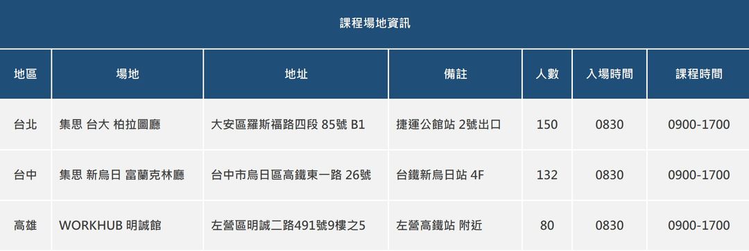 - 課程可重覆上課,不受場地限制,例如第一堂課可以重覆在台北、台中及高雄三地上課