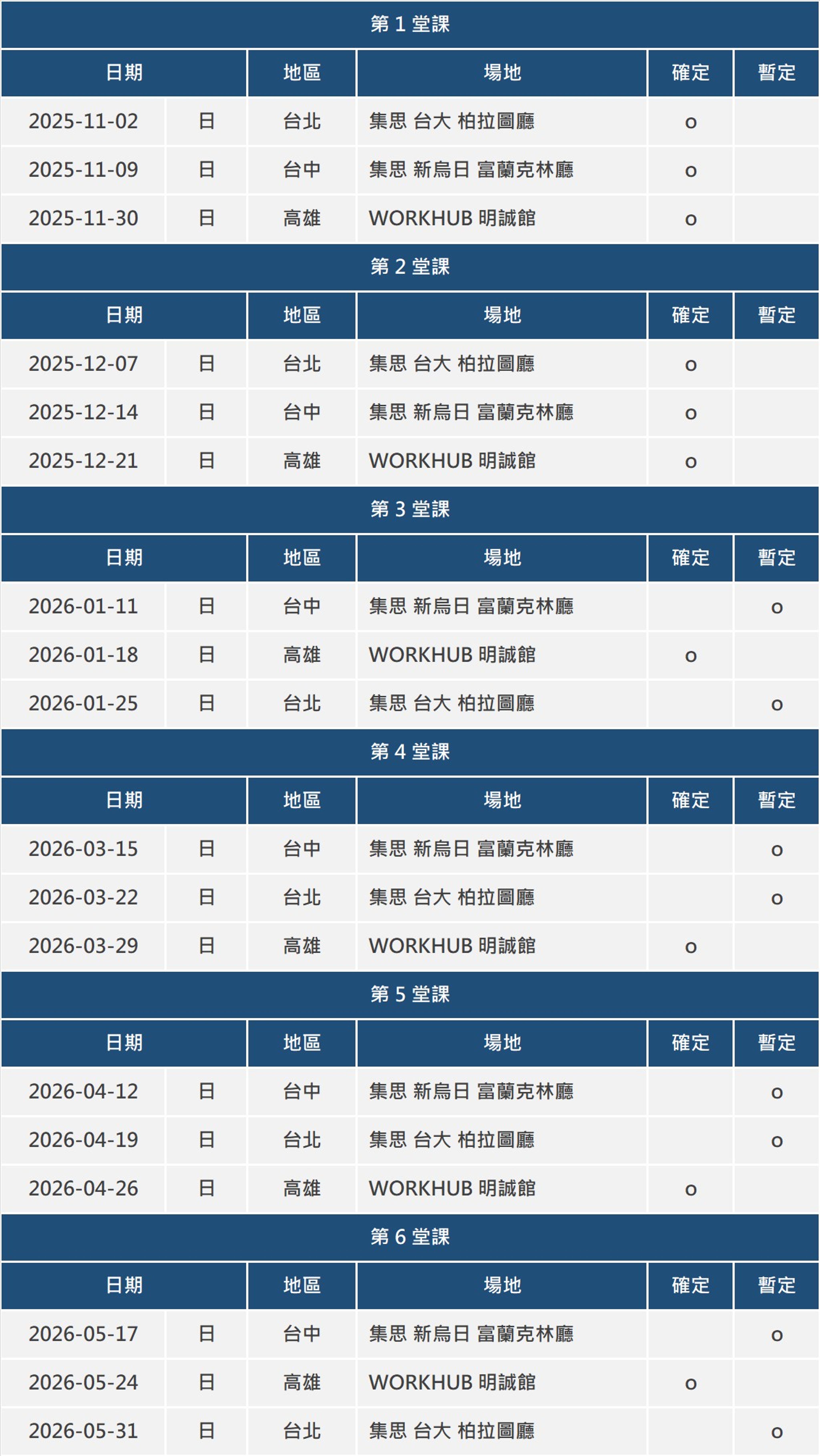 - 課程日期以 星期日 為主,國定假日 和 連續假期 不上課