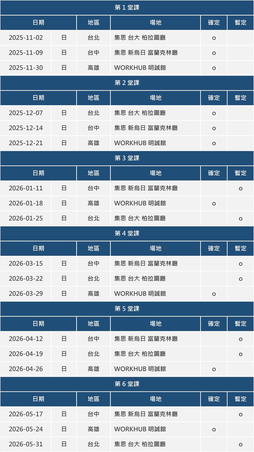 - 開課資訊參考如下 (因部份場地尚未開放預約,故為暫定,待場地底定後會再進行公告)